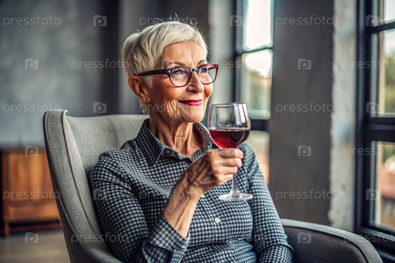 Современная, стильная пожилая женщина с короткими волосами со стаканом красного вина на стуле в гостиной дома