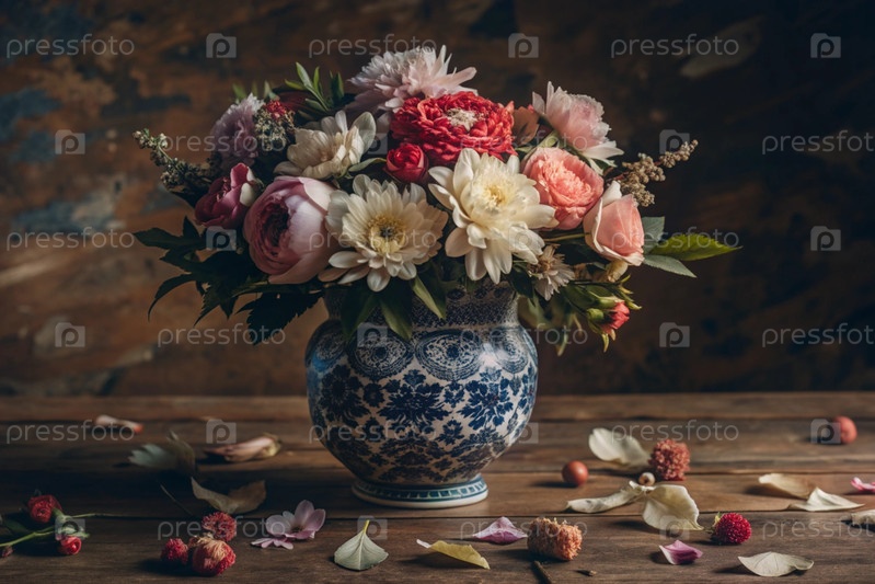 Красочное лето, осенний букет цветов различных красных, розовых и белых оттенков в вазе на столе