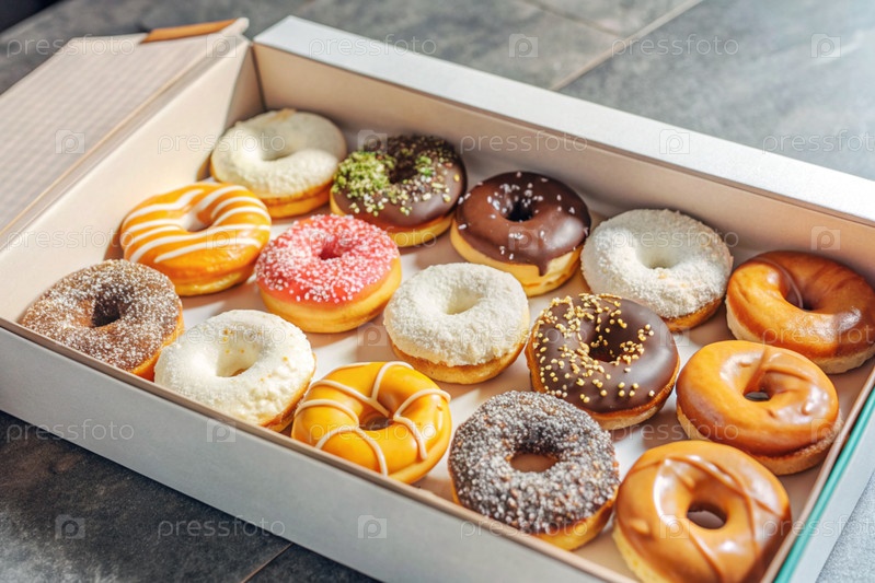 Вкусный десерт. больная коробка различных пончиков с красочными посыпаниями на столе. кондитерские изделия