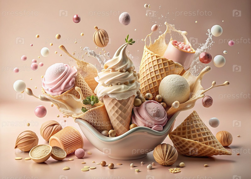 Абстрактная композиция с таяющим мороженым. Плески и брызги мороженого. натюрморт, изображающий перевернутый конус мороженого на светло-розовом фоне