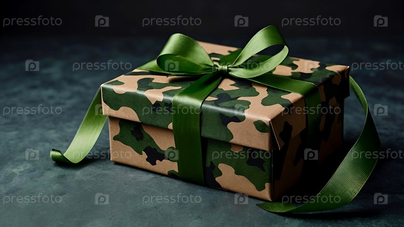 Концепция Дня защитника Отечества 23 февраля.Подарок камуфляжной коробки с праздничной сатинной лентой лука на тёмно-зеленом фоне