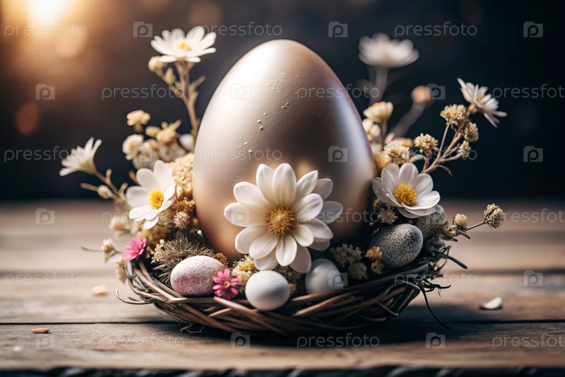 Пасхальный баннер. Концепция яркого пасхального праздника. Необычное деликатное пасхальное яйцо с нежными белыми цветами