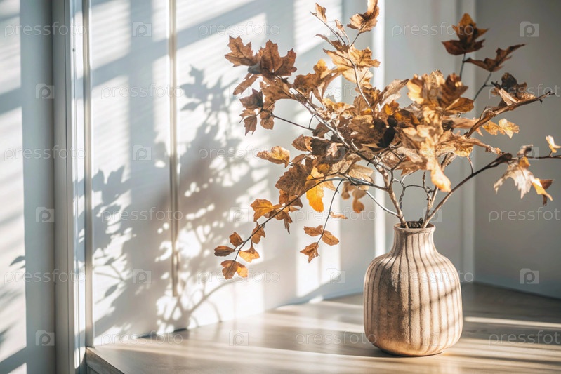 Ветви с золотыми осенними листьями в керамической вазе на деревянном столе у окна. Концепция домашнего комфорта. Осенний декор для Хэллоуина