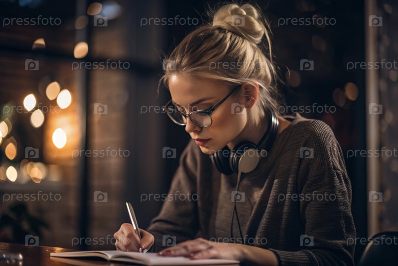 Молодая женщина фрилансер в очках и наушниках работает на ноутбуке или делает покупки в интернет-магазине