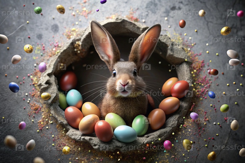 Известный праздник. милый пасхальный кролик заглядывает из ямы с красочными яйцами вокруг. концепция счастливой Пасхи