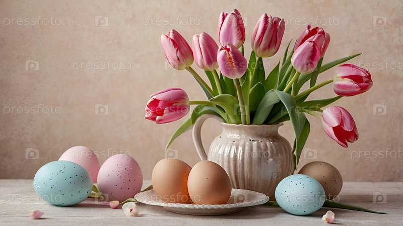 Букет тюльпанов и нежные пасхальные яйца на столе, красивая Пасхальная открытка. концепция минимализма