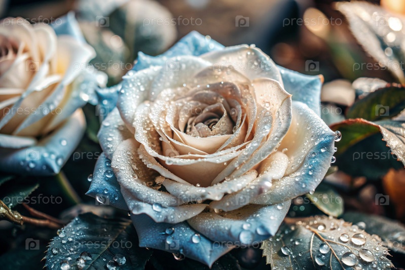 Кремовая роза красивого цвета кофе или шампанского, покрытая росой на рассвете. Красивое солнечное сияние. Фон изображения выполнен в зеленых и бежевых тонах. Естественный, экологически чистый естественный фон