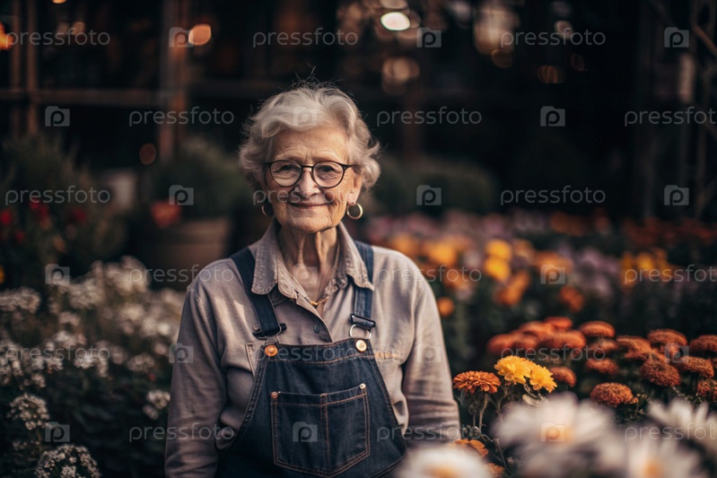 Пожилой садовник с седыми волосами в комбинезоне в уютной цветочной теплице