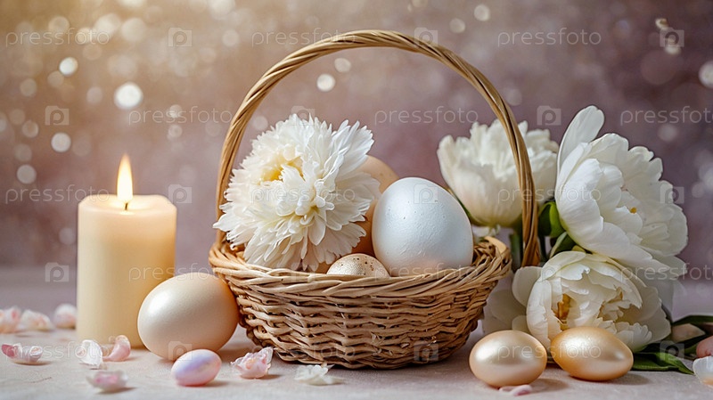 Нежные пасхальные яйца в жемчужной корзине и нежные цветы на пастельно-водном фоне