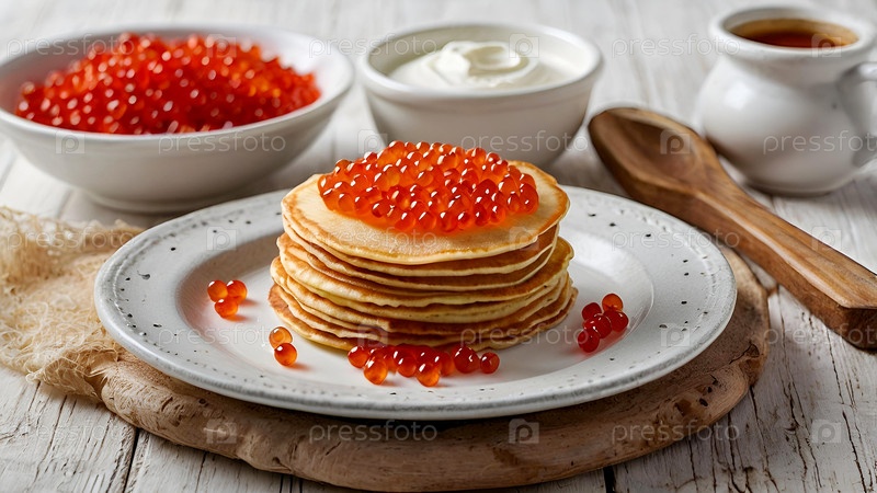 русские традиции. российский праздник Масленица. натюрморт с кучей блинов и красной икры на светло-бежевом фоне