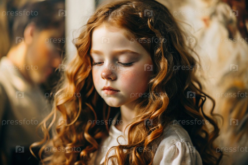 Портрет красивой маленькой рыжеволосой девочки с длинными волнистыми волосами и задумчивым взглядом.Власы развиваются и создают ощущение легкости и естественности