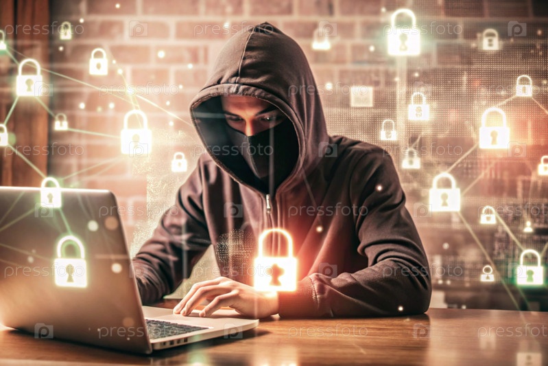 Хакер работает на ноутбуке, цифровые коды на виртуальном фоне. взлом и защита онлайн-данных. цифровые технологии, разработка программного обеспечения