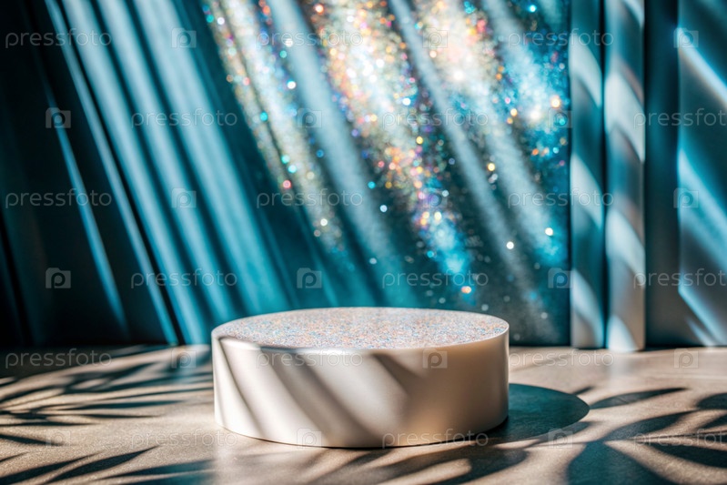Пустой цилиндрический подиум со сверкающими кристаллами при преломлении света на минималистическом фоне, стенд для демонстрации моделей косметики и товаров