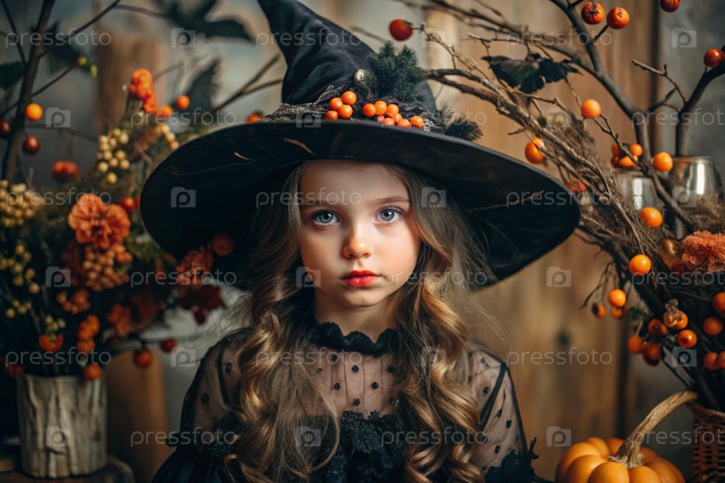 Осенний портрет красивой девушки в костюме ведьмы с осенними ягодами, тыквами и черными птицами. баннер, открытка. концепция Хэллоуина