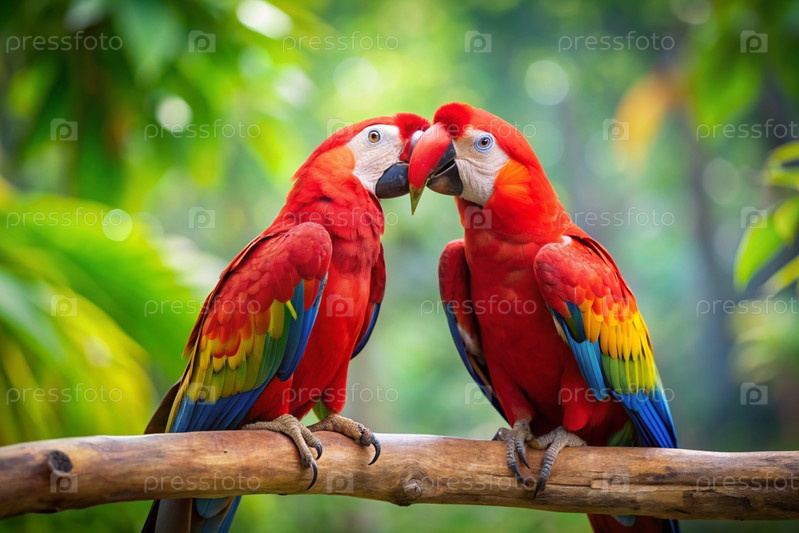 Два больших красных макак сидят на ветке на размытом тропическом фоне