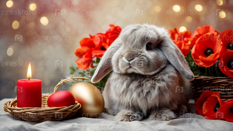 Концепция ярких пасхальных праздников - яркие пасхальные яйца в корзине из колючки, кролик и красные цветы на пастельном фоне воды