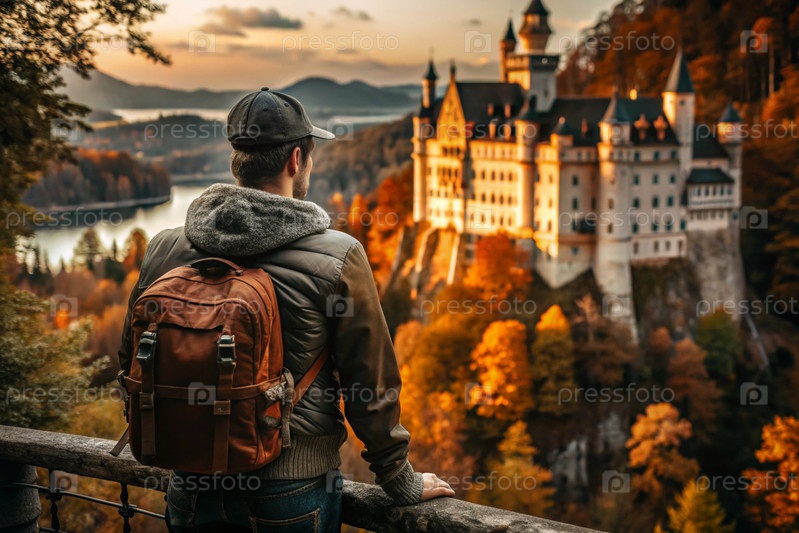 Мужчина-путешественник с рюкзаком на фоне огромного замка в осеннем лесу в горах. он путешествует и наслаждается жизнью и окружающей средой. туризм