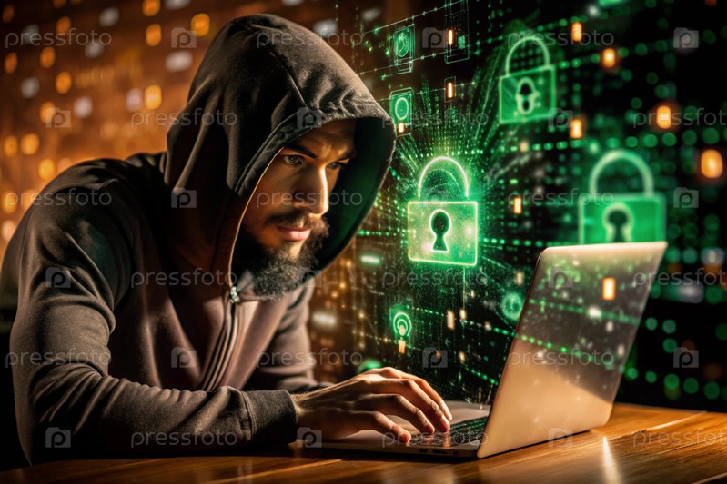Хакер работает на ноутбуке, цифровые коды на виртуальном фоне. взлом и защита онлайн-данных. цифровые технологии, разработка программного обеспечения