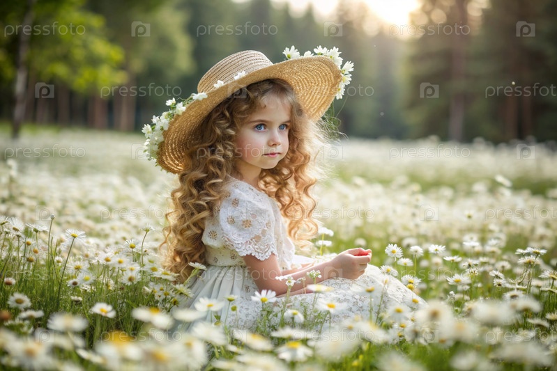 Всероссийский день семьи, любви и верности Красивая маленькая кудрявая девочка в соломенной шляпе с букетом ромашки на фоне поля. День святого Валентина Петра и Февронии