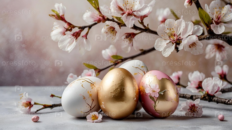 Нежные пасхальные яйца и вишневые ветви цветут на пастельном акварельном фоне с нежными полосками