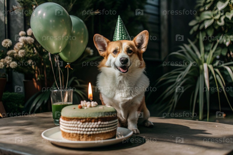Собака сидит с тортом, воздушными шарами и флагами на вечеринке по случаю дня рождения