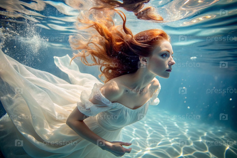 Портрет красивой рыжеволосой девушки в модном белом платье под водой на глубине