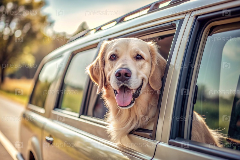 Собака выбивает голову из окна автомобиля, туристического фургона во время поездки в жаркий солнечный день