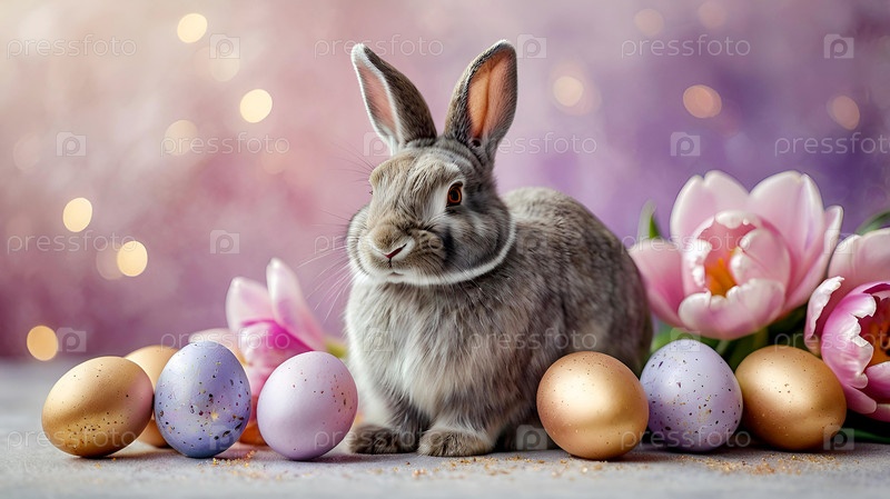 Нежные пасхальные яйца, серый кролик и цветы тюльпанов на пастельном акварельном фоне с нежными венами