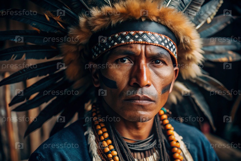 Красивый мужской портрет индейца, вождя племени в пернатом головном уборе
