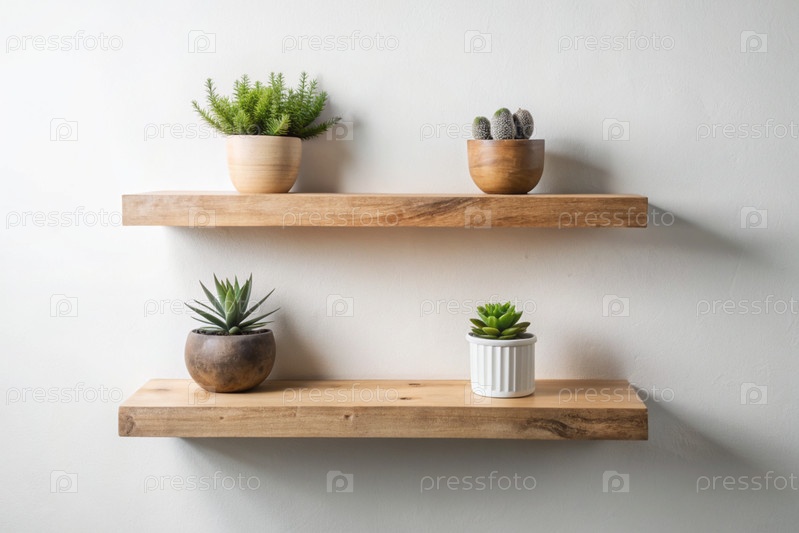 Детали дизайна интерьера. На яркой стене расположены деревянные полки с горшковыми растениями. Скандинавский стиль