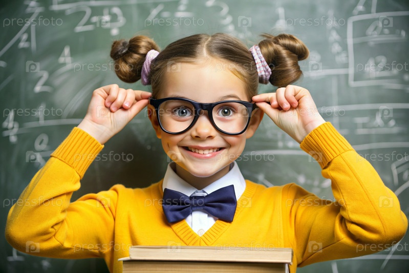 Красивая девушка с очками и книгами. Ребенок впервые ходит в школу. Ребёнок в классе с доской на заднем плане. Возвращение к школе