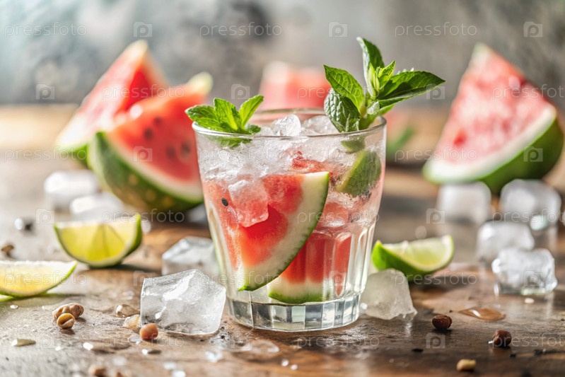 Свежий вкусный арбузный лимонад, мята, кубики льда и кусочки арбуза. летний освежающий напиток