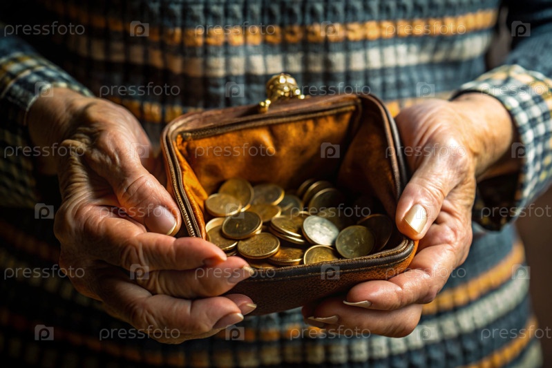 Бедность, проблемы с пенсией. Пожилой пенсионер держит старый кошелек. Последние деньги, трудности. Семейный бюджет с низким уровнем дохода