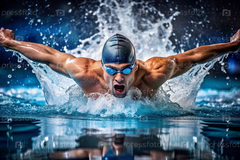 Спортивное плавание. Мужчины-плаватели. Спортсмен с очками в бассейне во время соревнований на близком расстоянии. Человек смотрит на камеру