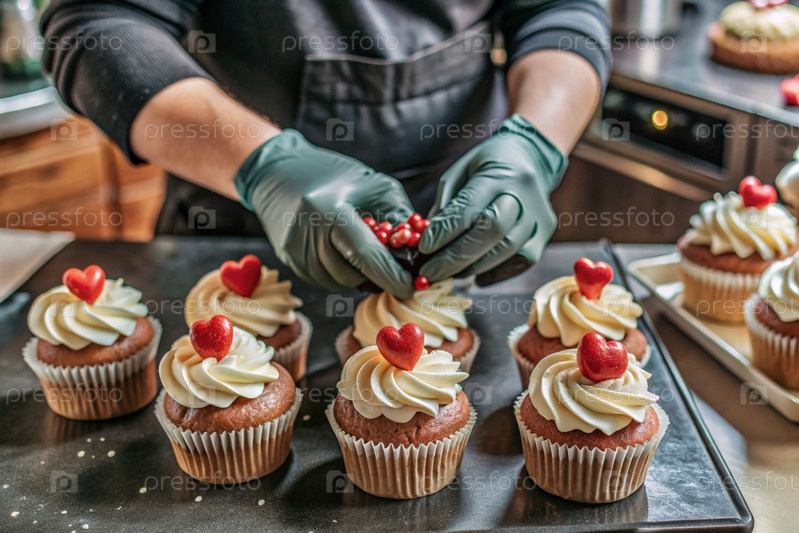 Профессиональный кондитер в перчатках украшает кексы сливочными и красными сердцами
