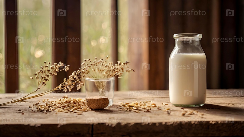 Органическое натуральное овсяное молоко в стеклянной бутылке на стильной деревянной доске и растения.Натуральные, экологически чистые продукты