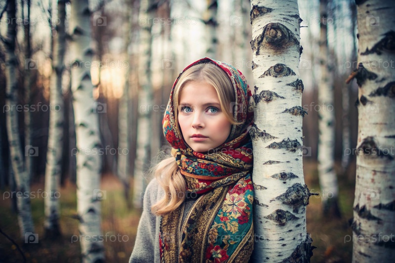 Красивая девушка в традиционном русском народном шале в весенней березовой роще.Портрет символизирует традиции и красоту русского народа