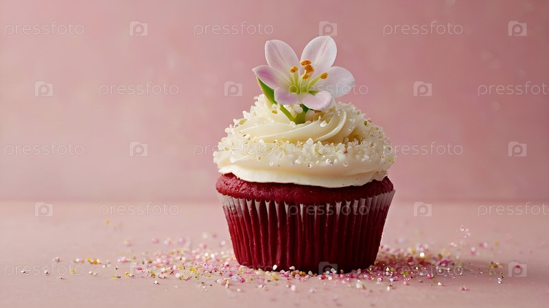 Воздушно-красный бархатный кексы с сливочным сыром и весенние цветы, окруженные сахарными искрами на тёплом розовом фоне 8 марта