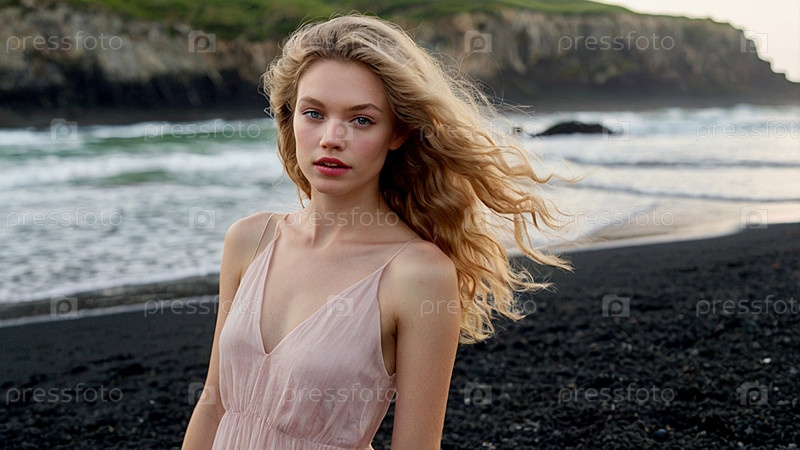 Портрет красивой женщины на пляже перед морем.Романтическая, спокойная и чувственная фотография девушки в проветренном нежном платье