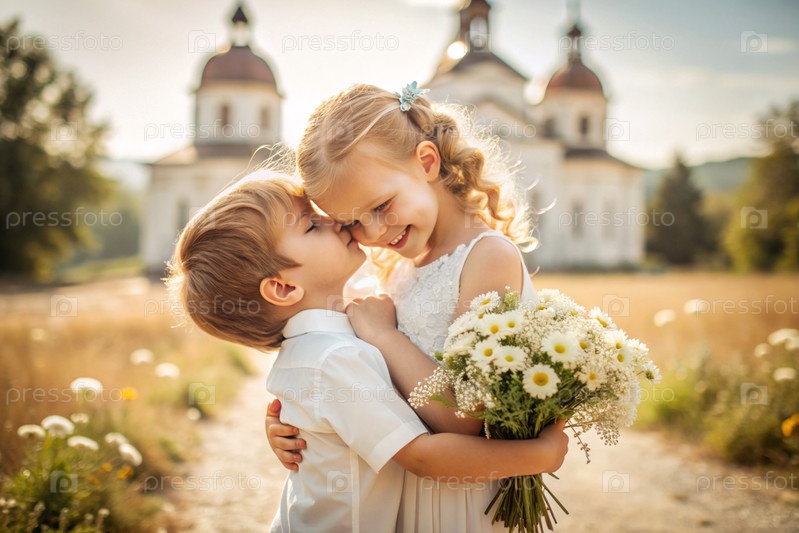 Всероссийский день семьи, любви, верности. милый мальчик и девочка с букетом ромашек на фоне православной церкви. День святого Валентина Петра и Февронии. религия, христианство