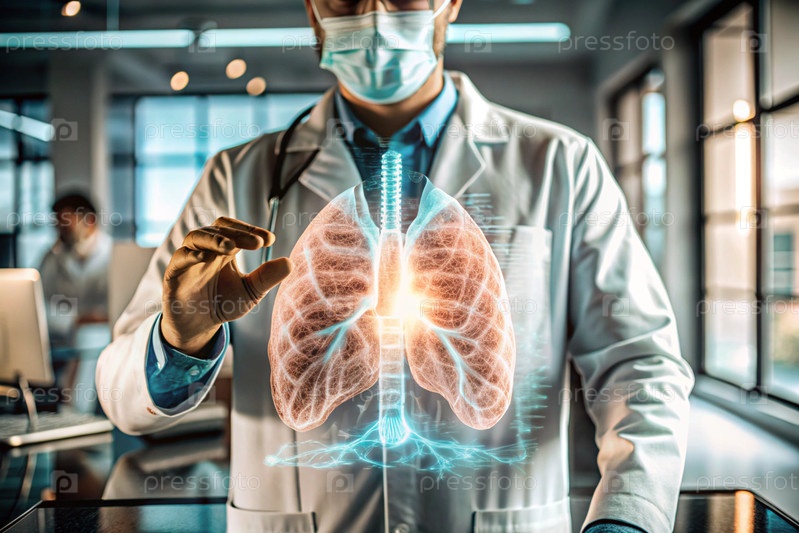 Врач в белом пальто демонстрирует голографическую модель человеческого легкого.Развитие медицинских технологий с использованием искусственного интеллекта