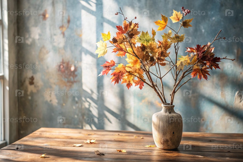 Ветви с золотыми осенними листьями в керамической вазе на деревянном столе у окна. Концепция домашнего комфорта. Осенний декор для Хэллоуина