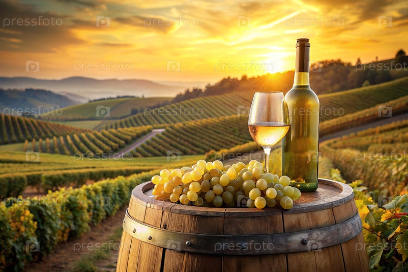 Бутылка белого вина и куча спелых виноград на деревянной дубовой бочке на фоне виноградника