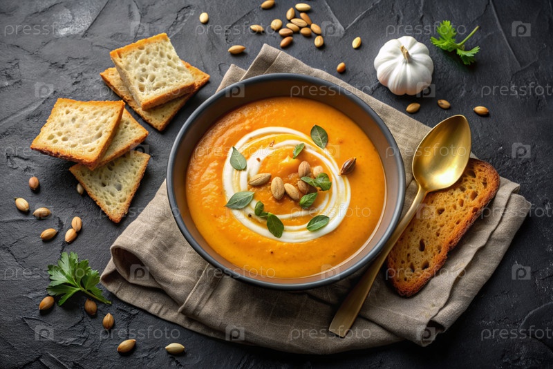 Традиционный мягкий тыквенный кремовый суп с сливками и семьями тыквы на черном бетонном фоне