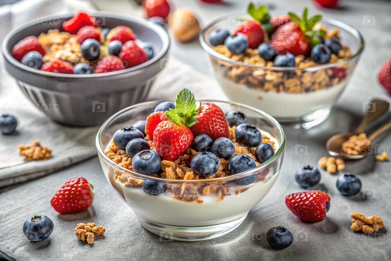 миска домашнего йогурта, мусли, ягод и орехов. здоровый и вкусный завтрак. доброе утро