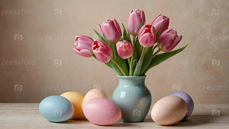 Букет тюльпанов и нежные пасхальные яйца на столе, красивая Пасхальная открытка. концепция минимализма