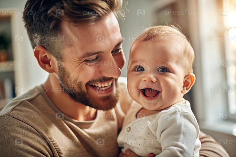 Прекрасный ребенок в объятиях отца. Счастливый ребёнок улыбается на камеру. Ребёнок весело смеётся. Концепция Дня отца