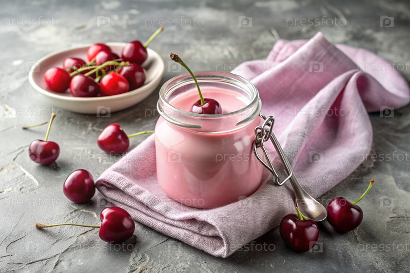 Домашний вишневый йогурт со свежими ягодами, старинной ложкой и полотенцем на стильном сером фоне