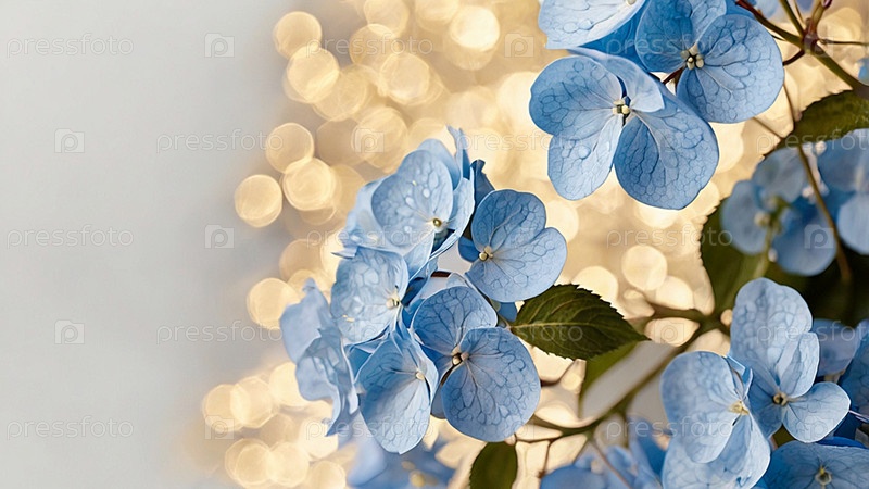 Голубые хортензии - это летние ароматные цветы. Красивый цветочный фон с красивым эффектом боке. Нежная голубая гортензия цветёт на белом акварельном фоне со золотыми венами