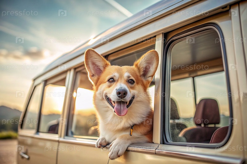 Собака выбивает голову из окна автомобиля, туристического фургона во время поездки в жаркий солнечный день